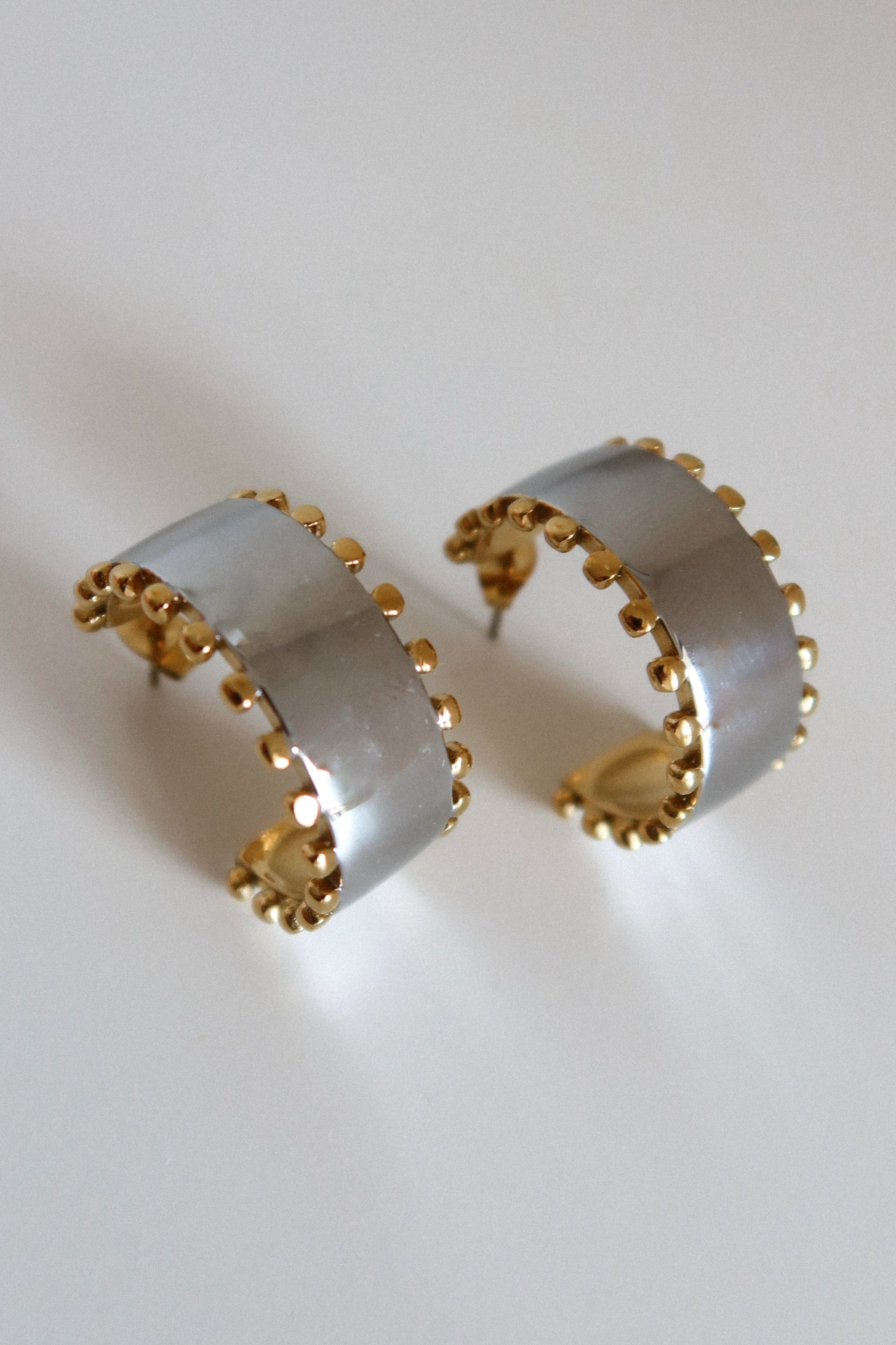 Brincos com borda trabalhada, com mistura de dourado e prateado.