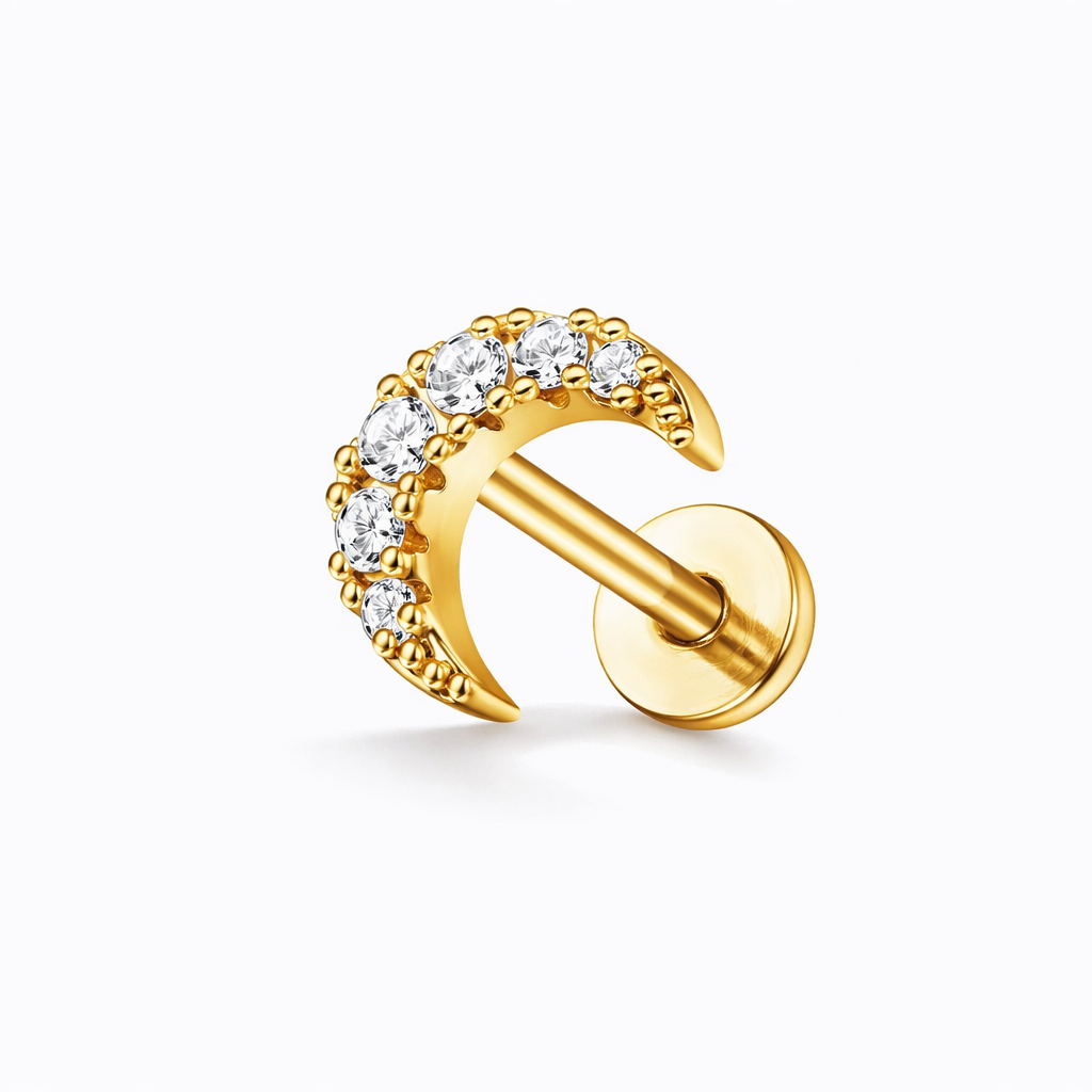Piercing em aço inoxidável com detalhes em zircónias. Ideal para cartilagem, hélix ou tragus, adapta-se facilmente a diferentes estilos e combinações.