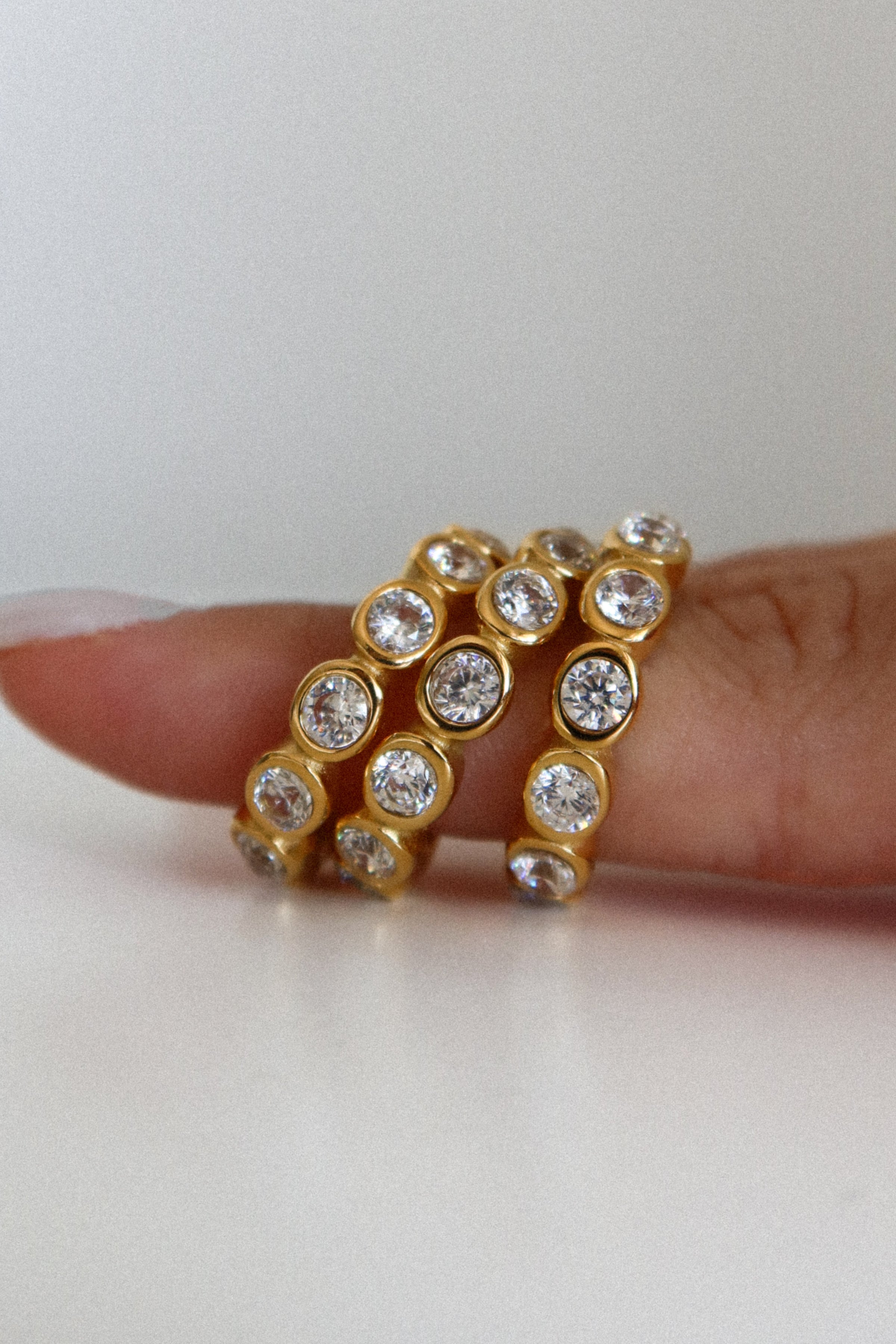 Anel minimalista, realçado por zirconias brancas cravejadas que conferem um brilho subtil.
